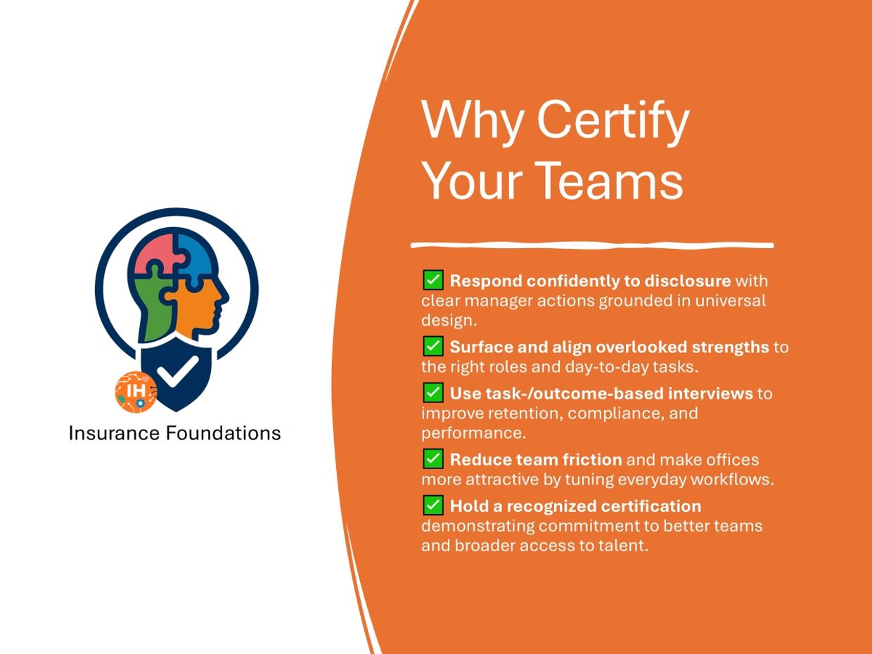 When someone tells a manager they’re neurodivergent, the response matters. The IH Insurance Foundations Certification equips leaders with universal design basics, everyday practices for working across cognitive differences, and task-based approaches to hiring and advancement—so managers know what to do in the moment.